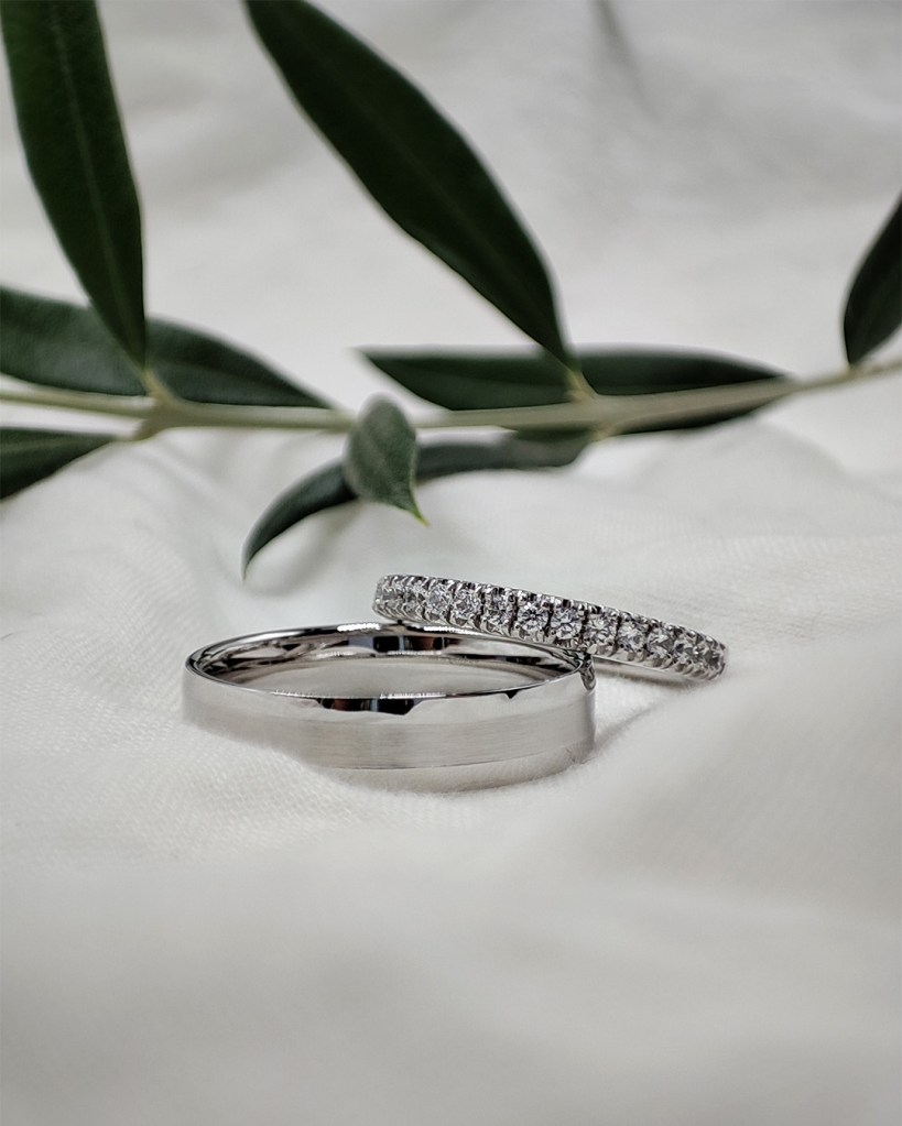 Chez Mohedano, comme dans la tendance, on retrouve aussi des formes florales, arrondies, voire des alliances en V ou « couronne » qui épouse la forme de la bague de fiançailles ; l’élégance au bout des doigts.